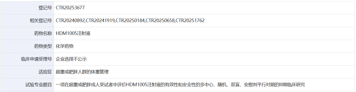 9 月 24 日,药物临床试验登记与信息公示平台官网显示,华东医药旗下中美华东登记了一项国内 Ⅲ 期临床,以评估 HDM1005 注射液在超重或肥胖成人受试者中的有效性和安全性。Insight 数据库显示,这是 HDM1005 启动的首个Ⅲ期临床。