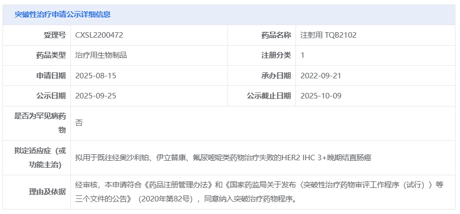 9 月 25 日,CDE 官网显示,正大天晴 1 类新药 TQB2102 又一适应症拟纳入突破性治疗品种,适应症为:用于既往经奥沙利铂、伊立替康、氟尿嘧啶类药物治疗失败的 HER2 IHC 3+晚期结直肠癌。