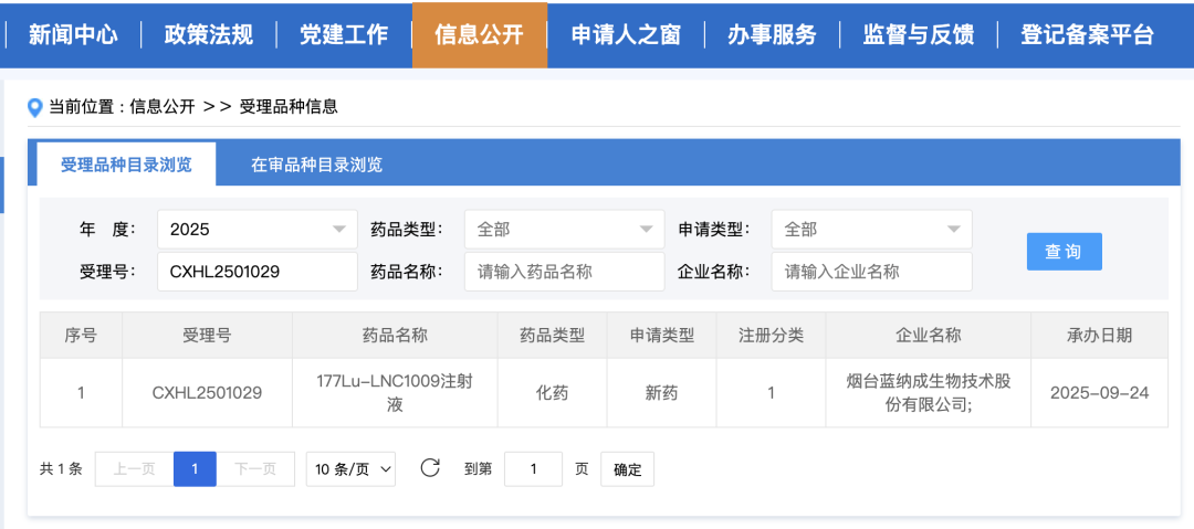 近日,国家药品监督管理局药品审评中心(CDE)官方网站公示信息显示,由烟台蓝纳成生物技术股份有限公司申报的"177Lu-LNC1009注射液"已获得获得国家药品监督管理局药品审评中心受理公开,受理号为CXHL2501029)。177Lu-LNC1009注射液(177Lu-FAPI-RGD)拟用于治疗FAP和/或αvβ3阳性的成人实体瘤患者。