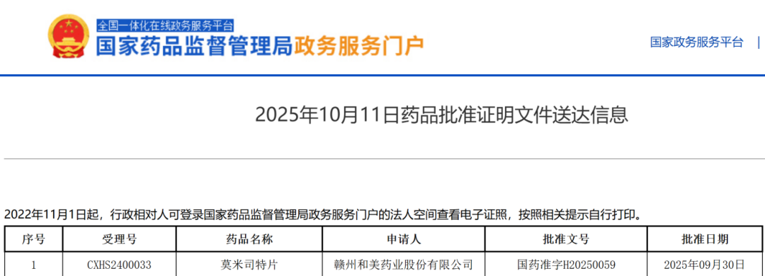 10月11日,NMPA官网显示,赣州和美药业申报的1类新药莫米司特片获批上市,为国内获批的首款自主研发的PDE4小分子创新药,为斑块状银屑病(PS)患者带来新的治疗选择。