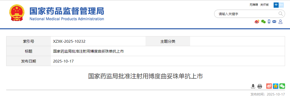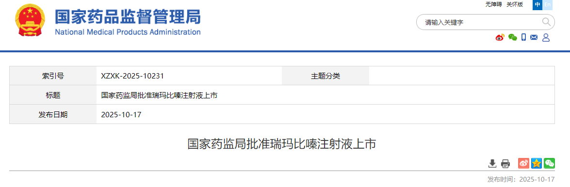 2025年10月17日,继此前批准1类创新药莫米司特片上市后(详见:NMPA:又一新药获批上市!),国家药监局批准了1类创新药瑞玛比嗪注射液和注射用博度曲妥珠单抗上市。