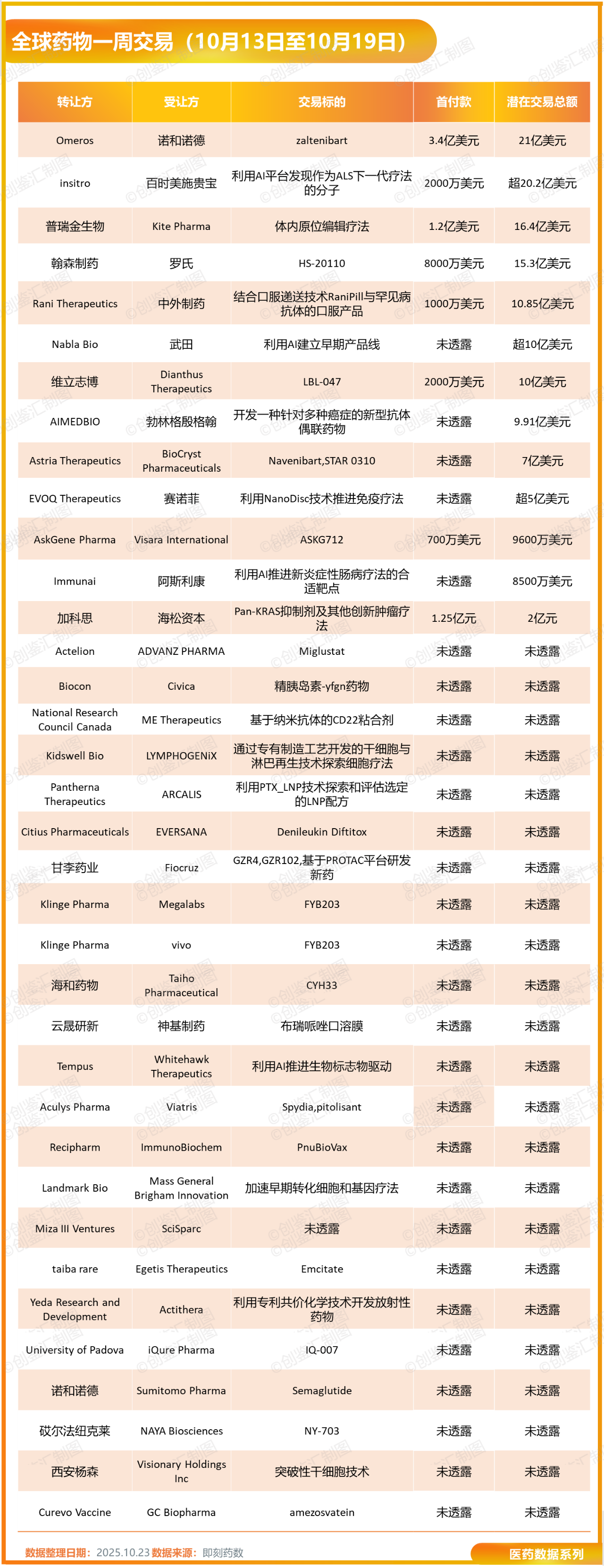 据创鉴汇不完全统计,0月13日至10月19日全球生物医药领域共披露37起交易事件,潜在交易总额超127亿美元。交易以17起合作研发和10起药物授权为主要形式,罗氏、阿斯利康、诺和诺德等跨国药企参与了多笔大额交易。