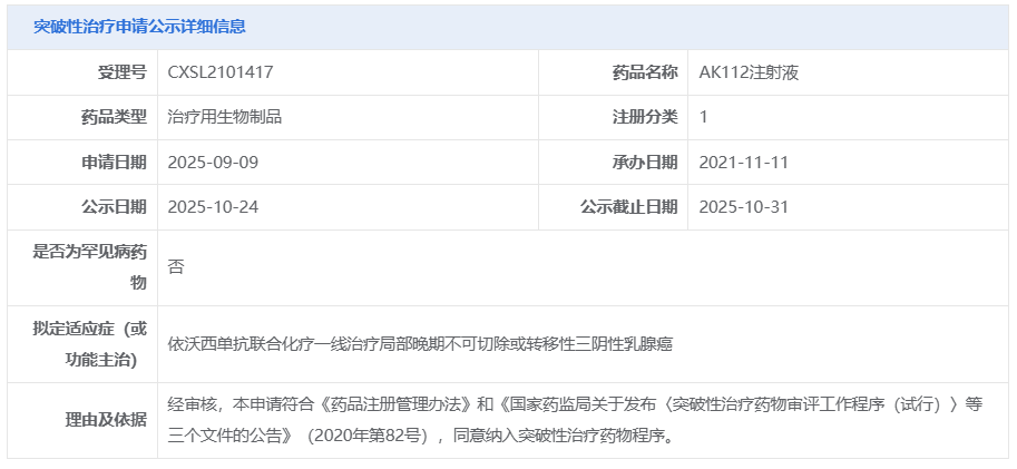 10 月 24 日,CDE 官网显示,康方生物 AK112 注射液(依沃西单抗)又一项申请拟纳入突破性治疗,适应症为依沃西单抗联合化疗一线治疗局部晚期不可切除或转移性三阴性乳腺癌。