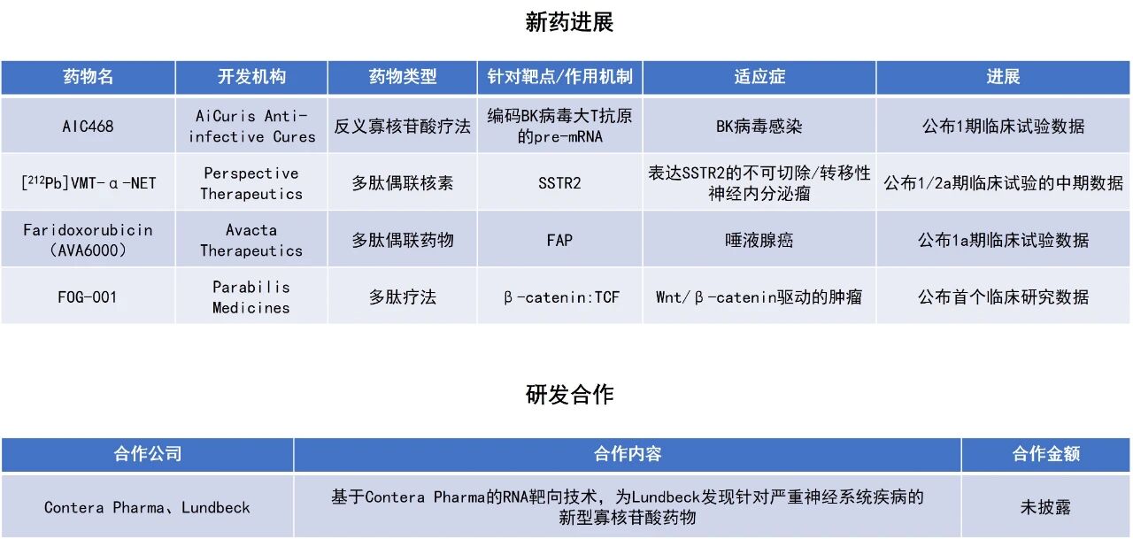 近期,全球多肽和寡核苷酸(TIDES)领域迎来系列进展。靶向“不可成药”靶点的多肽偶联药物FOG-001公布首个临床研究的亮眼数据,在硬纤维瘤患者中的疾病控制率(DCR)达100%,客观缓解率(ORR)达80%。在研多肽偶联药物AVA6000的1期临床试验结果积极,唾液腺癌队列的DCR达91%。多肽偶联核素疗法[212Pb]VMT-α-NET在一项1/2a期临床试验中,使87.5%的不可切除/转移性神经内分泌瘤(NET)患者没有疾病进展。本文将节选其中部分重要进展做简单介绍,仅供读者参阅。