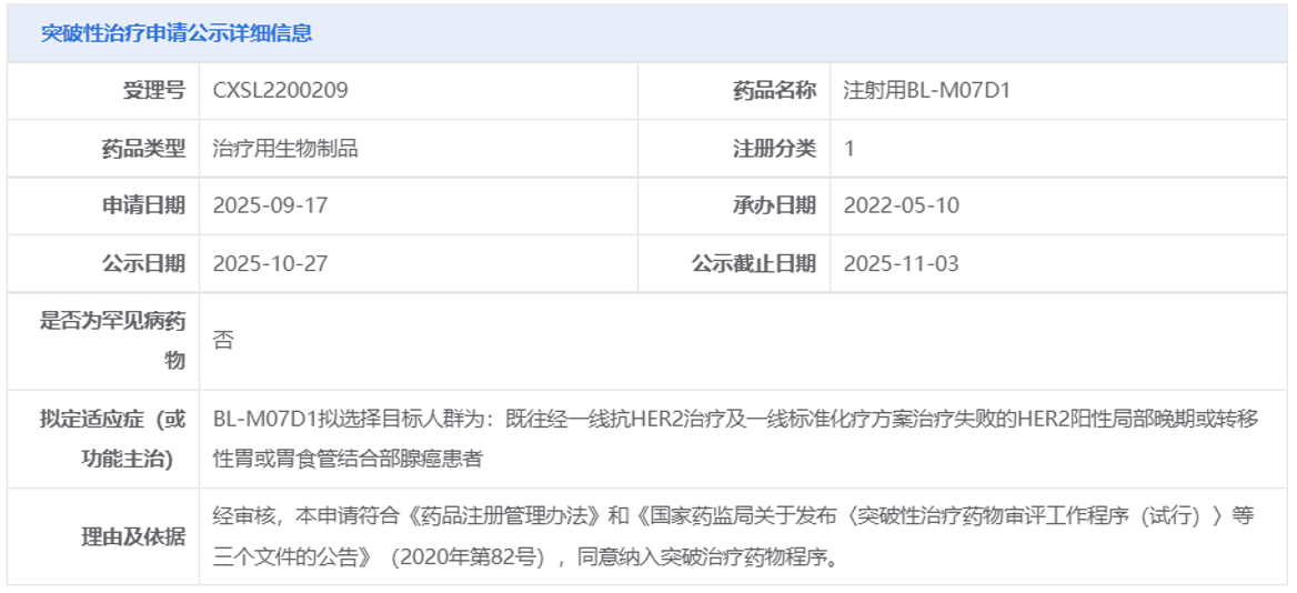 10月27日,CDE官网显示,百利天恒1类新药注射用BL-M07D1被CDE拟纳入突破性治疗品种,用于既往经一线抗HER2治疗及一线标准化疗方案治疗失败的HER2阳性局部晚期或转移性胃或胃食管结合部腺癌患者。