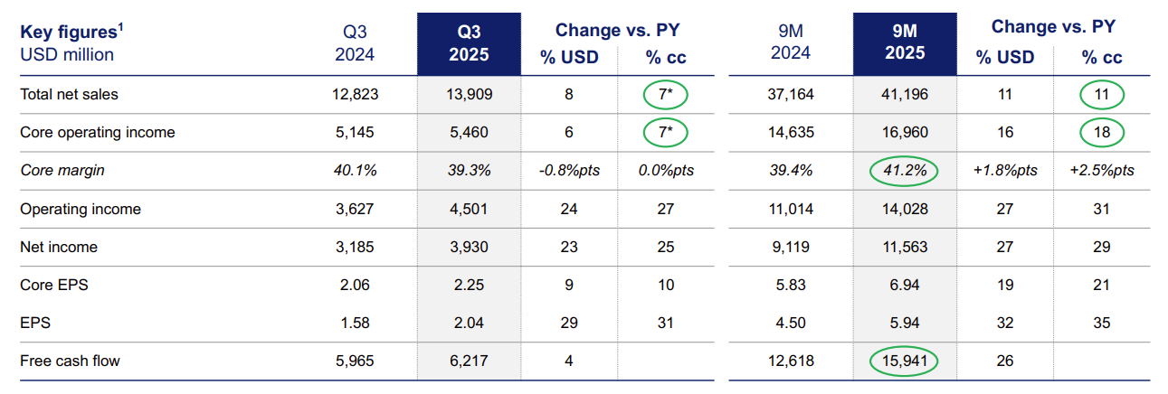 10 月 28 日,诺华发布了 2025 Q3 财报,前九个月业绩表现强劲,净销售额达 411.96 亿美元,同比增长 11%(按照固定汇率),核心营业收入 169.6 亿美元,上涨 18%;其中第三季度净销售额为 139.09 亿美元,同比增长 7%,净利润为 39.3 亿美元,同比增长 25%。