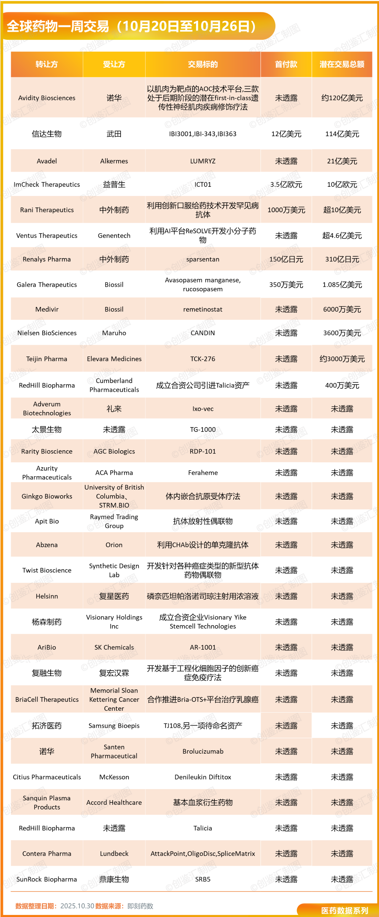 据创鉴汇不完全统计,10月20日至10月26日全球生物医药领域共披露32起交易事件,潜在交易总额超285亿美元,主要由诺华120亿美元的并购,以及信达生物114亿美元的药物授权两项重磅交易推动。并购和药物授权较活跃,神经科学、肿瘤治疗及前沿给药技术成为上周最受关注的领域。