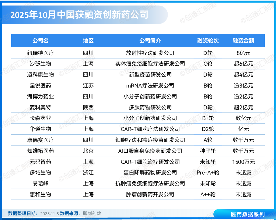 今年10月,据创鉴汇不完全统计,中国创新药领域共披露14起融资事件,累计公开融资金额近30亿元人民币。融资覆盖从种子轮到D轮的多阶段轮次。放射性疗法、细胞治疗、mRNA技术等前沿方向获资本密集加码,地域上四川省(4家:纽瑞特、迈科康、海博为、康德赛)和上海市(5家:沙砾、华道、长森、元码、易慕峰)成为10月融资高地。