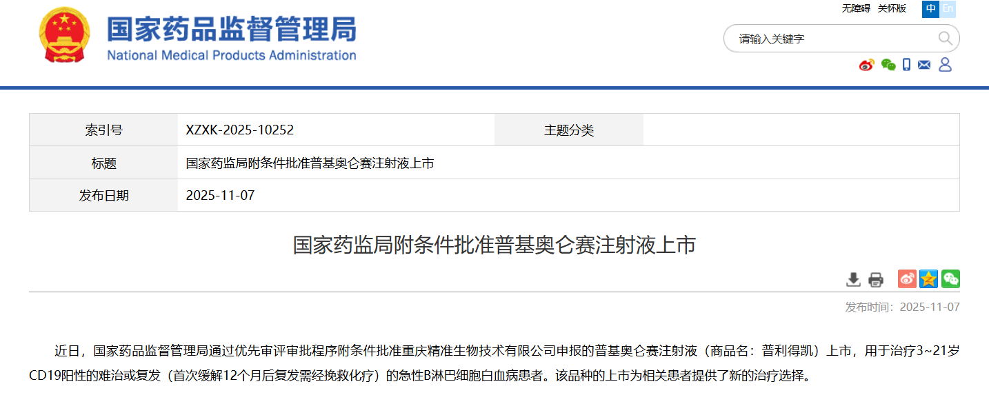 11 月 7 日,NMPA 官网宣布已于近日批准重庆精准生物申报的 1 类生物新药普基仑赛注射液(pCAR-19B 细胞自体回输制剂)上市,用于治疗 3~21 岁 CD19 阳性的难治或复发(首次缓解 12 个月后复发需经挽救化疗)的急性 B 淋巴细胞白血病患者。此前,该药曾被 CDE 纳入突破性治疗和优先审评。*如需获取 2025 年。