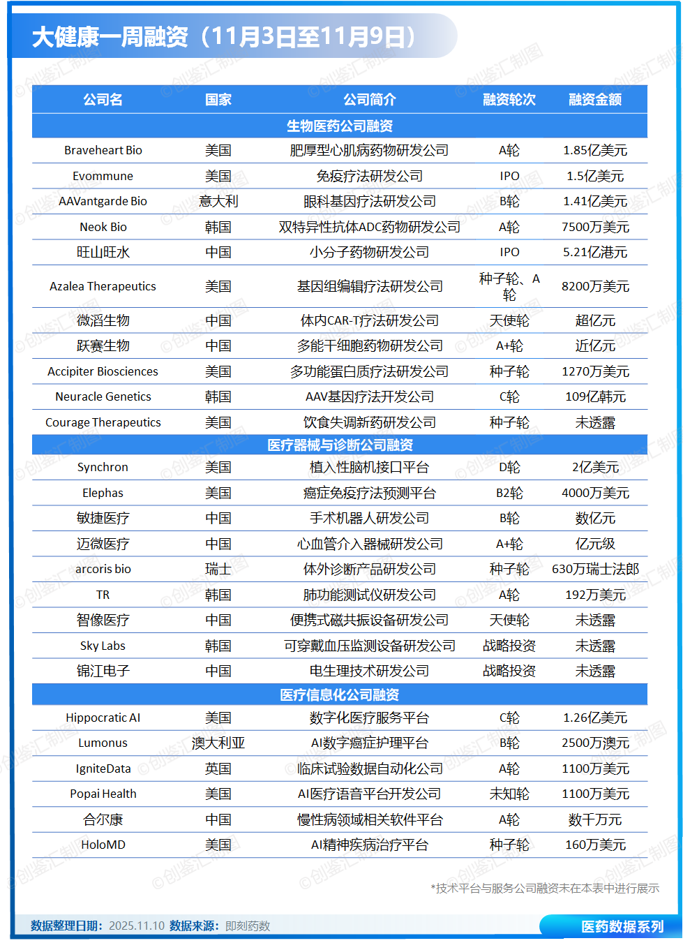 据创鉴汇不完全统计,上周(11月3日至11月9日),全球大健康领域共披露融资事件28起,总额超12亿美元。