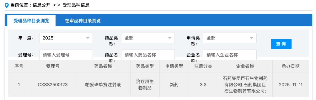 11 月 11 日,CDE 官网显示,石药集团帕妥珠单抗注射液上市申请获受理,用于治疗 HER2 阳性乳腺癌。这是国内第 5 款申报上市的帕妥珠单抗生物类似药。
