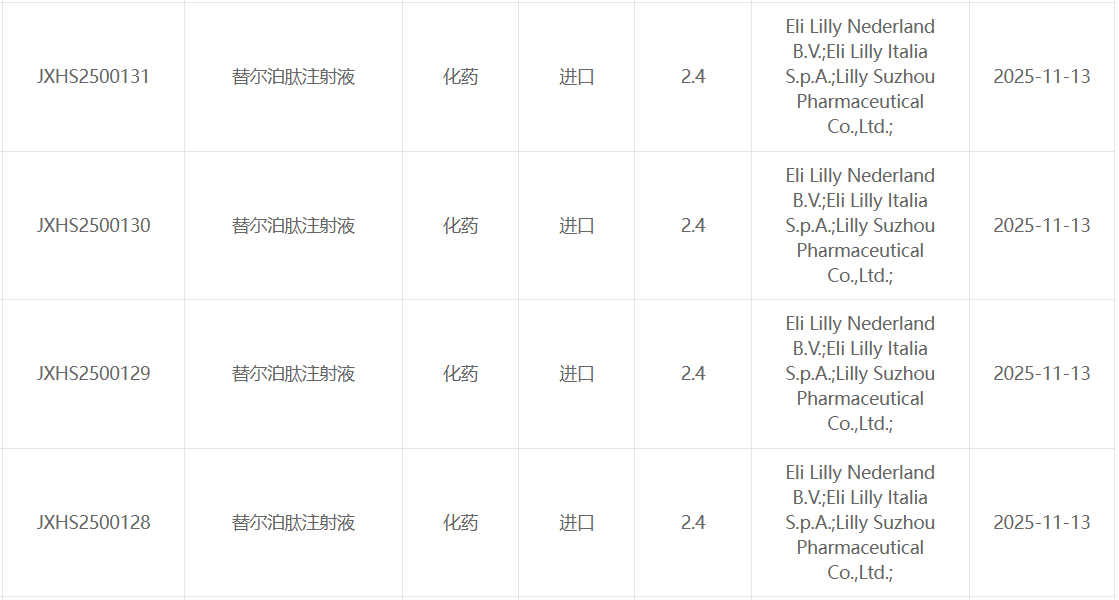 2025年11月13日,CDE官网显示,礼来申报的替尔泊肽(GLP-1R/GIPR 双重激动剂)新适应症上市申请已获受理。