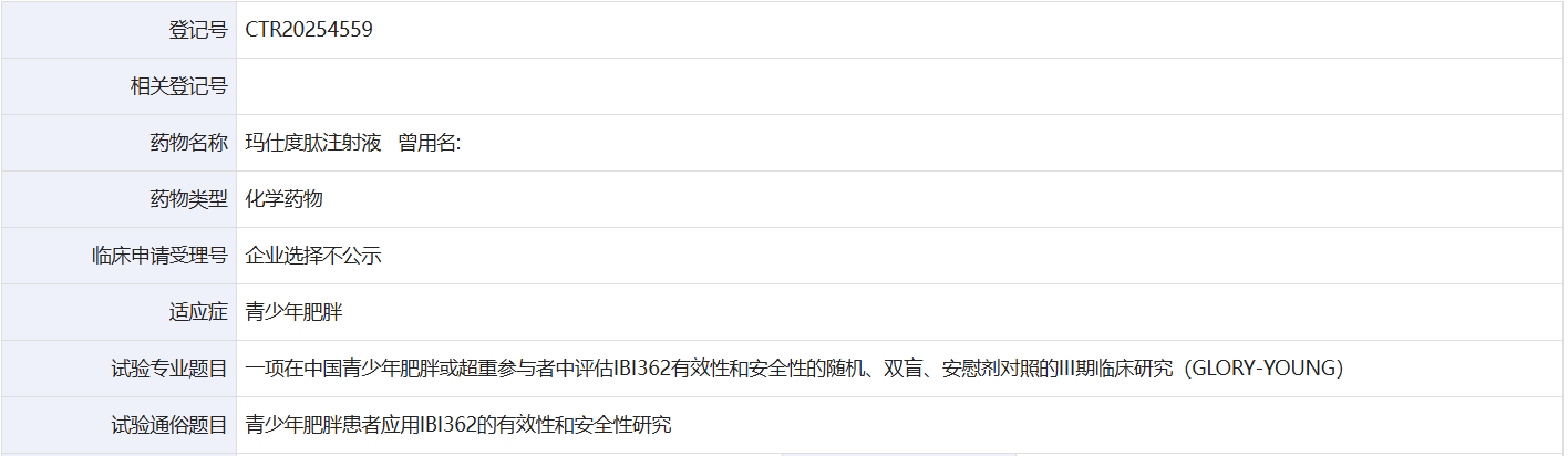 11 月 19 日,药物临床试验登记与信息公示平台官网显示,信达生物登记了一项 III 期临床研究(CTR20254559),旨在中国青少年肥胖或超重参与者中评估 IBI362(玛仕度肽)的有效性和安全性。
