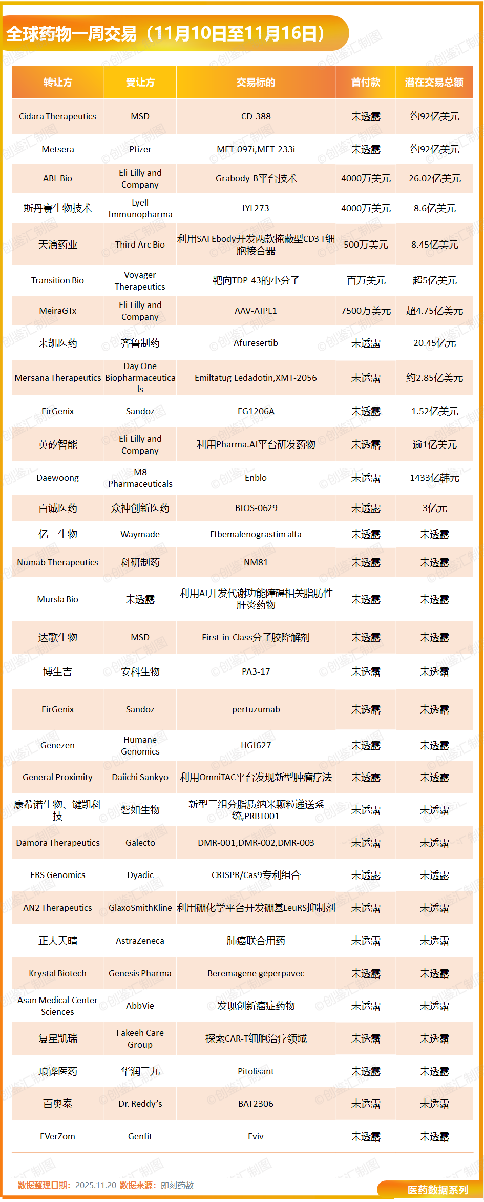 据创鉴汇不完全统计,上周(11月10日至11月16日)全球生物医药领域共披露32起交易事件,潜在交易总额超246亿美元。