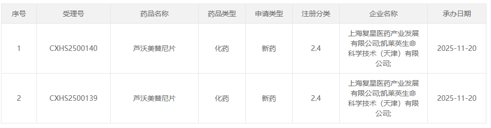 11 月 20 日,CDE 官网显示,复星医药芦沃美替尼片新适应症申报上市,用于 2 岁及 2 岁以上朗格汉斯细胞组织细胞增生症(LCH)儿童患者。此前该适应症已被 CDE 纳入优先审评。