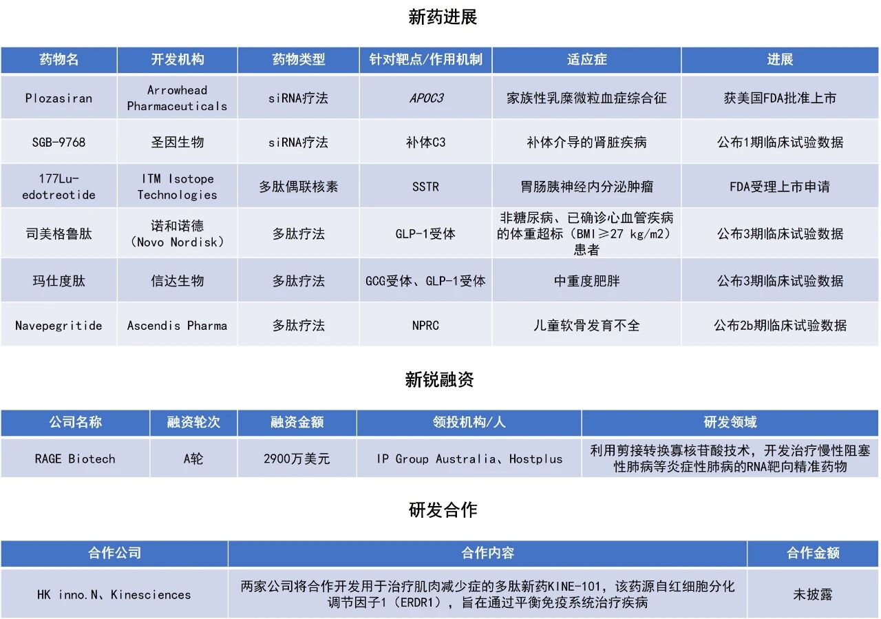 近期,全球多肽和寡核苷酸(TIDES)领域迎来系列进展。Arrowhead Pharmaceuticals公司的RNAi疗法Redemplo(plozasiran)获美国FDA批准作为饮食控制的辅助治疗,用于降低家族性乳糜微粒血症综合征(FCS)成人患者的甘油三酯(TG)水平。《柳叶刀》上发表的司美格鲁肽的一项3期临床试验预设分析结果显示,该药的大部分心血管保护作用是通过独立于脂肪减少的其他机制实现的。GCG/GLP-1双受体激动剂玛仕度肽注射液在中国中重度肥胖人群中开展的一项3期临床研究达成主要终点和所有关键次要终点,即将递交新药上市申请。本文将节选其中部分重要进展做简单介绍,仅供读者参阅。
