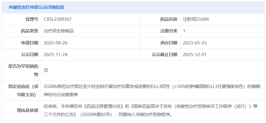 2025 年 7 月,CDE 已授予 ZG006 突破性治疗,用于单药治疗复发或进展的晚期小细胞肺癌患者。