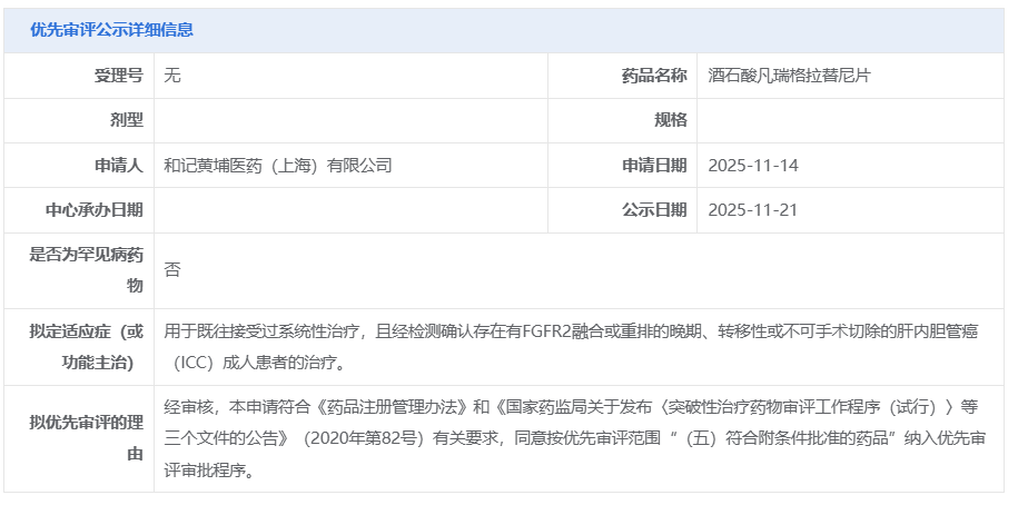 11 月 21 日,CDE 官网显示,和黄医药酒石酸凡瑞格拉替尼片拟纳入优先审评,适应症为:用于既往接受过系统性治疗且经检测确认存在有 FGFR2 融合或重排的晚期、转移性或不可手术切除的肝内胆管癌(ICC)成人患者的治疗。