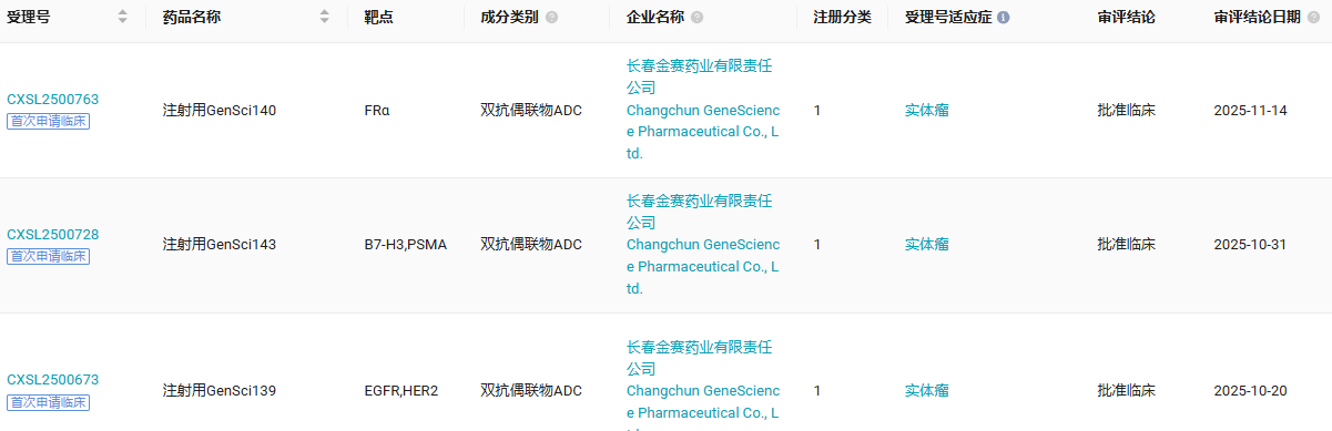 根据 Insight 数据库,近期金赛药业有三款双抗 ADC 首次在国内获批临床,分别是注射用 GenSci139、注射用 GenSci143 以及注射用 GenSci140。本文将对这三款药物的基本信息进行介绍,仅供参阅。