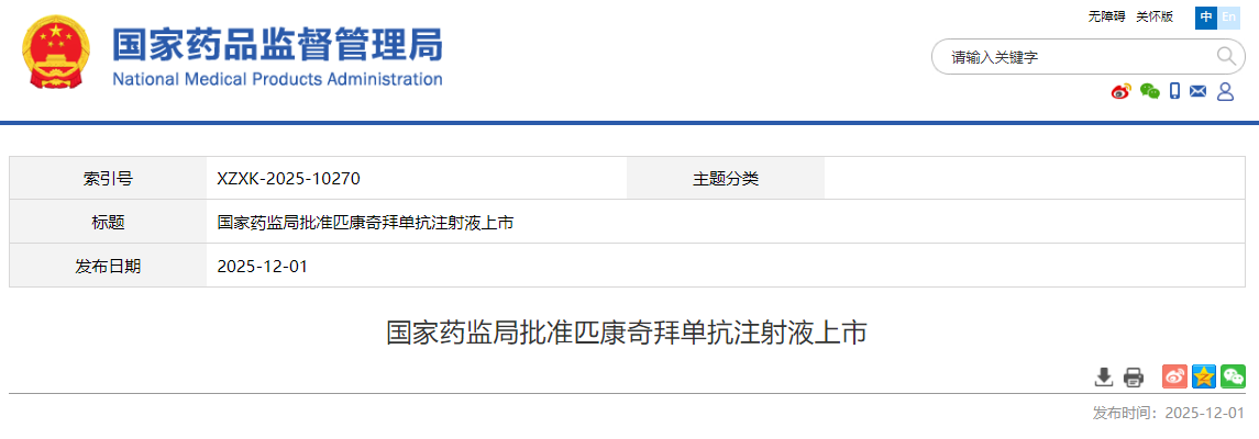 2025年12月01日,国家药监局批准了信达生物申报的匹康奇拜单抗注射液上市,该药品适合系统性治疗的中重度斑块状银屑病成人患者。