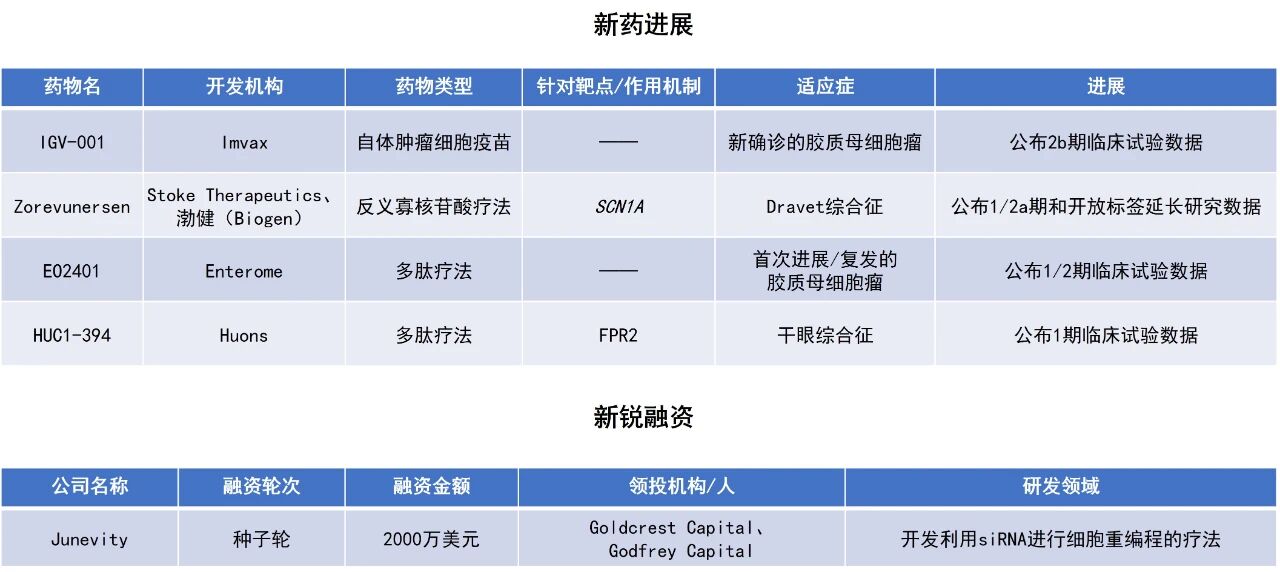 近期,全球多肽和寡核苷酸(TIDES)领域迎来系列进展。癌症疫苗IGV-001用于治疗新确诊的胶质母细胞瘤(ndGBM)的早期临床试验结果积极,患者的中位总生存期(mOS)为20.3个月,较安慰剂组延长45%。免疫疗法EO2401联合nivolumab及bevacizumab的三联治疗在一项早期临床试验中,使首次进展/复发的胶质母细胞瘤患者相比未接受手术者获得了显著的生存获益。本文将节选其中部分重要进展做简单介绍,仅供读者参阅。