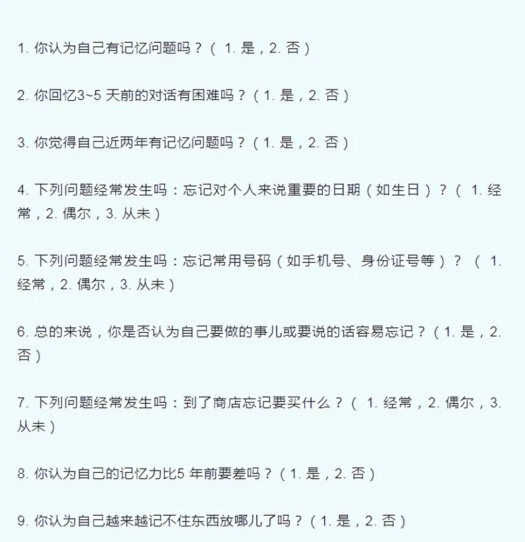不过需要注意的是,该测试仅作简单参考,不能作为诊断老年痴呆的依据。测试如下: