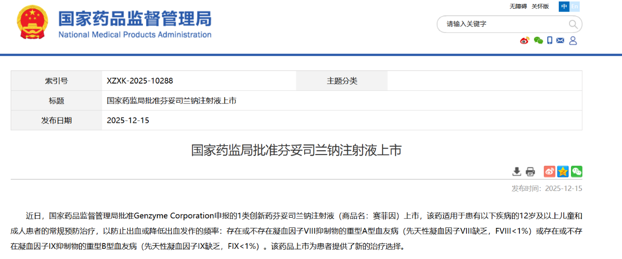 12月15日,国家药品监督管理局(NMPA)宣布批准Genzyme Corporation(健赞)1类创新药芬妥司兰钠注射液(商品名:赛菲因)上市,用于患有以下疾病的12岁及以上儿童和成人患者的常规预防治疗,以防止出血或降低出血发作的频率:存在或不存在凝血因子VIII抑制物的重型A型血友病(先天性凝血因子VIII缺乏,FVIII<1%)或存在或不存在凝血因子IX抑制物的重型B型血友病(先天性凝血因子IX缺乏,FIX<1%)。