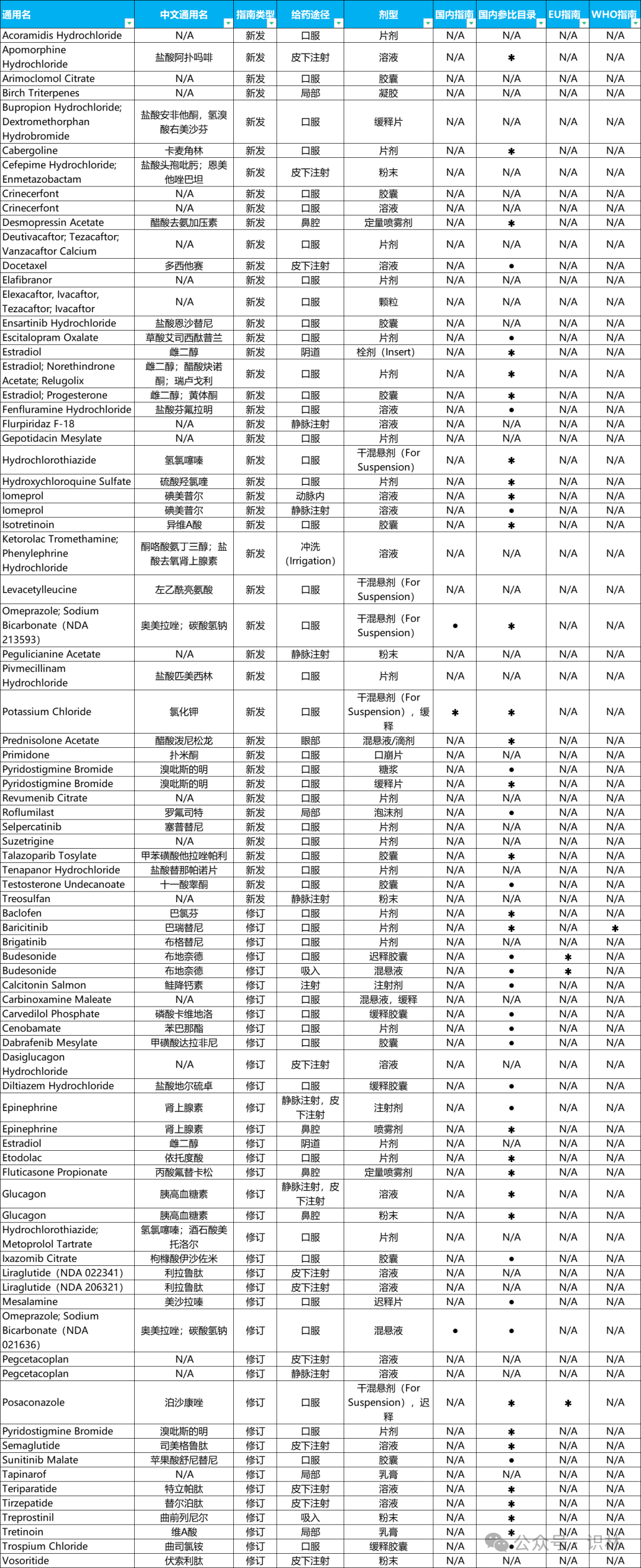 N/A表示未查到对应指南或品规,或未查到官方中文通用名。