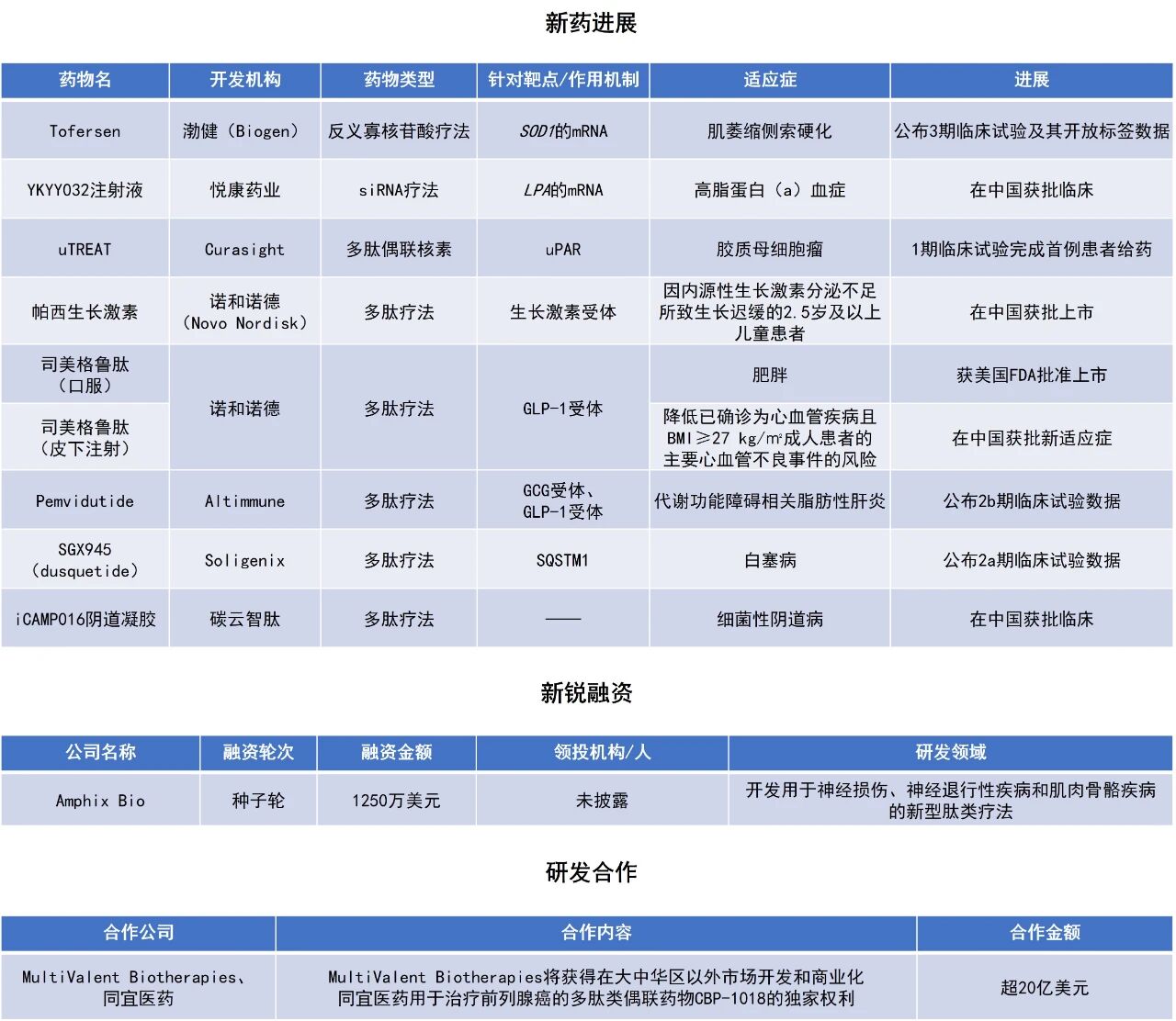 近期,全球多肽和寡核苷酸(TIDES)领域迎来系列进展。诺和诺德(Novo Nordisk)宣布多款多肽疗法的积极新进展:每日一次25 mg司美格鲁肽口服片剂(Wegovy)获美国FDA批准;司美格鲁肽注射液的心血管适应症上市申请获得中国国家药品监督管理局(NMPA)批准;NMPA正式批准长效生长激素注射液帕西生长激素的上市申请。本文将节选其中部分重要进展做简单介绍,仅供读者参阅。