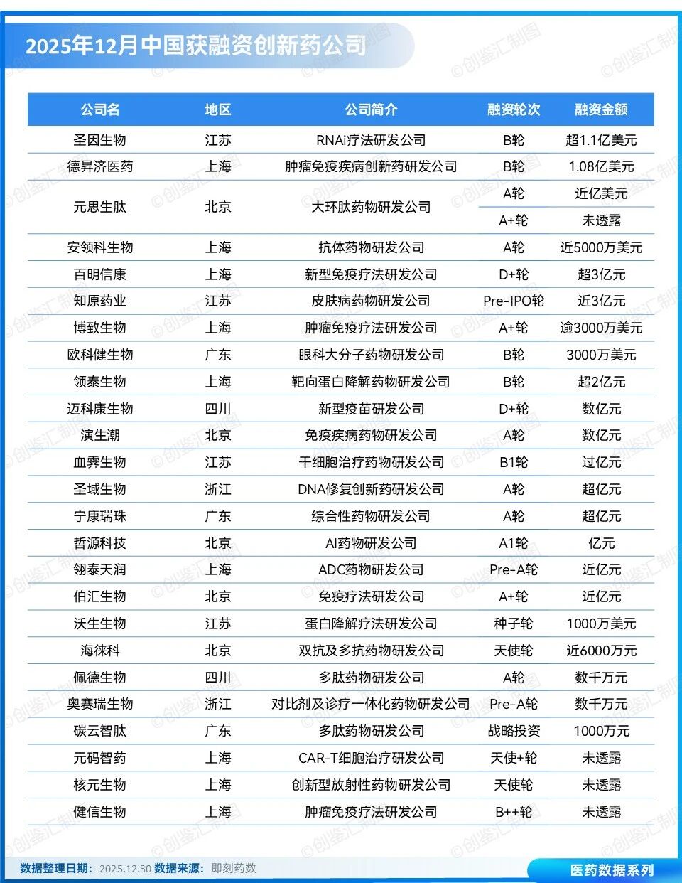 截至12月30日,据创鉴汇不完全统计,中国创新药领域共披露26起融资事件,25家创新药公司获融资,披露融资总额超7亿美元,融资热度较上月稳中有升。从地域看,上海(9家)、北京(5家)、江苏(4家)为融资主力地区;资本持续加码临床中后期项目。RNAi疗法、肿瘤免疫、多肽药物等领域表现亮眼,礼来、辉瑞、阿斯利康等跨国药企深度参与投资,彰显中国创新药技术平台的全球吸引力。