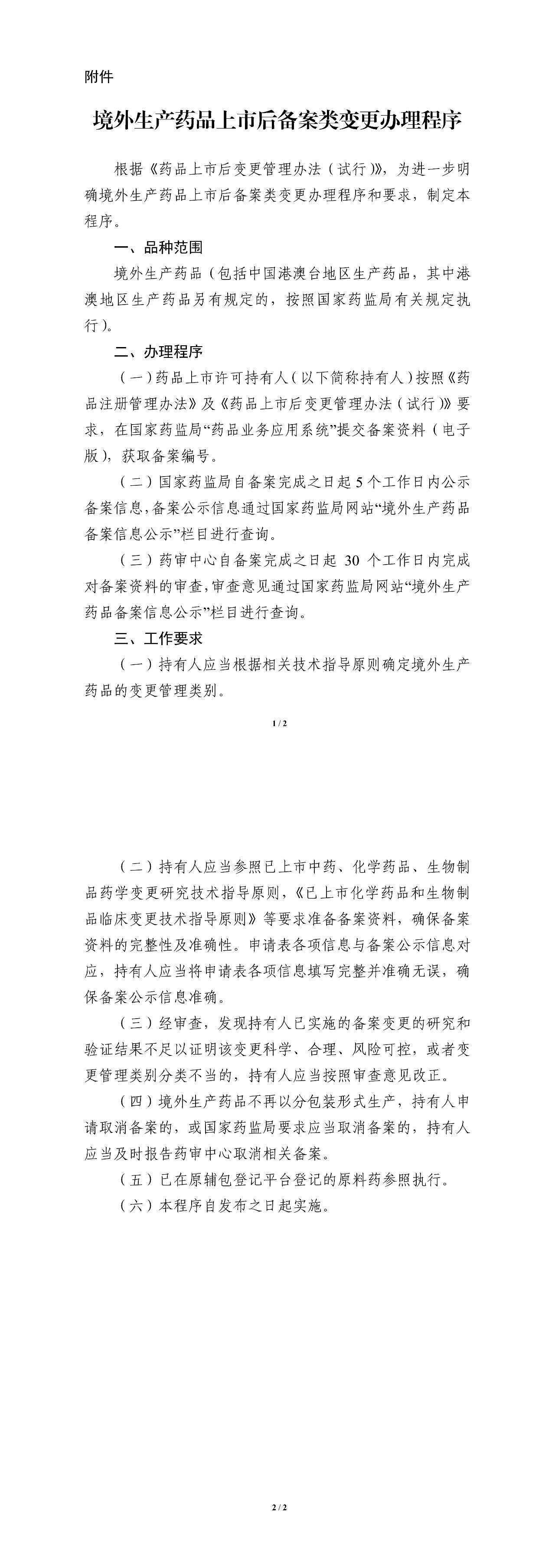 根据《药品上市后变更管理办法(试行)》,在国家药品监督管理局的部署下,药审中心组织制定了《境外生产药品上市后备案类变更办理程序》(见附件)。