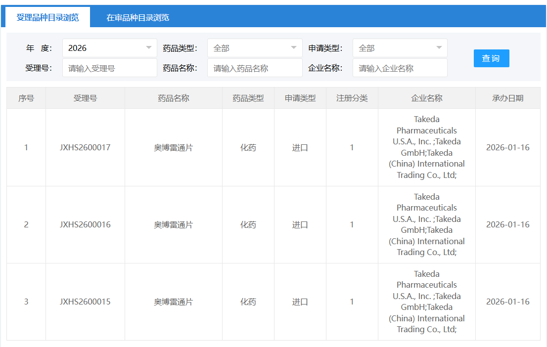 1 月 16 日,CDE 官网显示,武田在国内递交了 1 类新药奥博雷通片的上市申请。根据武田的公开资料,Insight 数据库推测该药为武田开发的食欲素受体 2 (OX2R) 激动剂 Oveporexton(TAK-861),本次申报的适应症可能为 1 型发作性睡病。2024 年 9 月,Oveporexton 的该适应症已被 CDE 纳入突破性治疗品种。