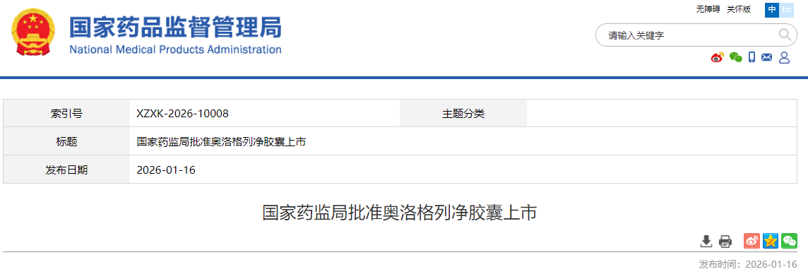 2026年01月16日,国家药监局批准了宜昌东阳光长江药业股份有限公司申报的1类创新药奥洛格列净胶囊上市。