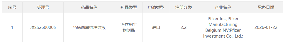 1 月 22 日,CDE 官网显示,辉瑞 1 类新药「马塔西单抗注射液」新适应症申报上市,注册分类为 2.2 类。根据公开信息和临床试验进展,Insight 数据库推测本次适应症为抑制先天性血友病患者(存在凝血因子 VIII 或因子 IX 抑制剂)的出血倾向。