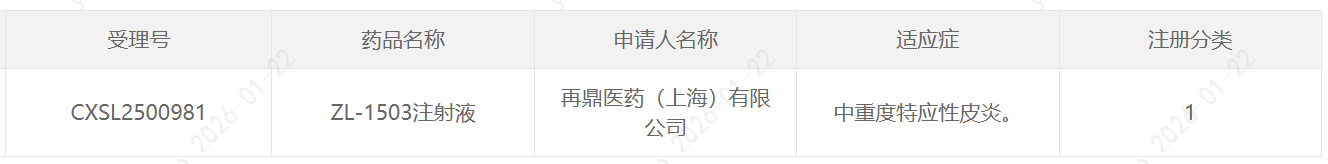 1月22日,中国国家药品监督管理局药品审评中心(CDE)官网最新公示,再鼎医药申报的1类新药ZL-1503注射液获批临床,拟开发治疗中重度特应性皮炎。根据再鼎医药公开资料,这是该公司内部研发团队发现及开发的一款IL-13/IL-31R双特异性抗体,该产品有望用于治疗中重度特应性皮炎及其他2型辅助性T细胞(Th2)介导的疾病。