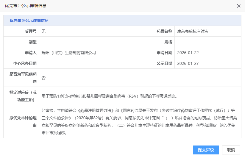 1 月 27 日,CDE 官网显示,瑞阳制药申报的库莱韦单抗注射液拟纳入优先审评,用于预防 1 岁以内新生儿和婴儿因呼吸道合胞病毒(RSV)引起的下呼吸道感染。
