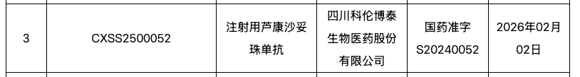 2 月 6 日,NMPA 官网显示,科伦博泰 TROP2 ADC 芦康沙妥珠单抗(sac-TMT)获批一项新适应症,用于治疗既往接受过内分泌治疗且在晚期或转移性阶段接受过其他系统治疗的不可切除的局部晚期或转移性激素受体阳性(HR+)且人表皮生长因子受体 2 阴性(HER2-)乳腺癌(BC)成人患者。此前该适应症已被 CDE 纳入优先审评审批程序。