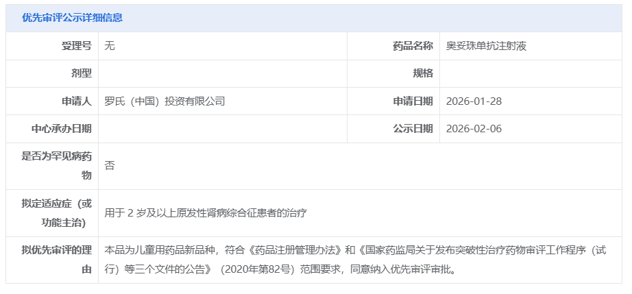 2 月 6 日,CDE 官网显示,罗氏的奥妥珠单抗注射液拟纳入优先审评,适应症为用于 2 岁及以上原发性肾病综合征患者的治疗。