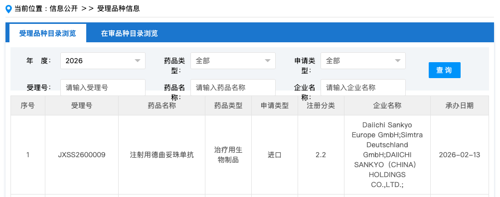2 月 13 日,CDE 官网显示,第一三共注射用德曲妥珠单抗新适应症上市申请获受理。根据临床试验进展,Insight 推测适应症为用于接受抗 HER2 新辅助治疗后仍残存侵袭性病灶的 HER2 阳性成人乳腺癌患者的治疗。该适应症刚刚获得 CDE 突破性疗法资格。
