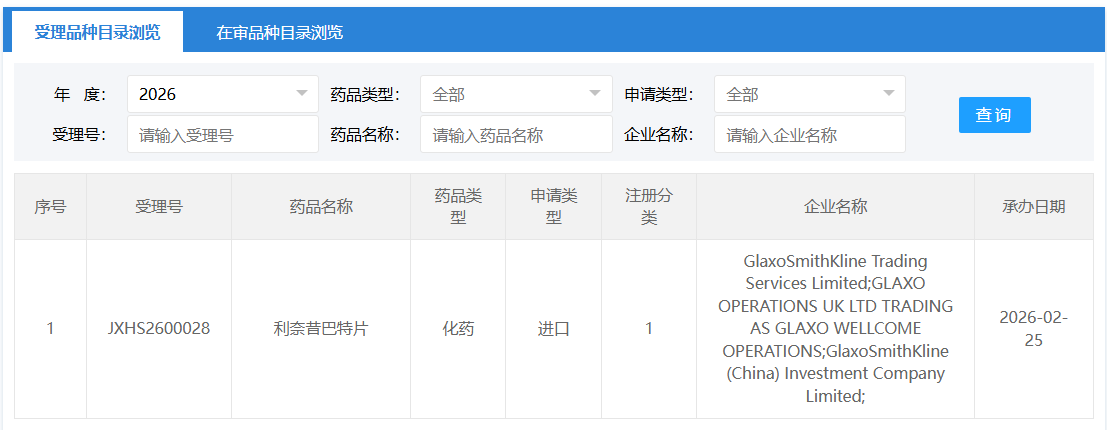 2 月 25 日,CDE 官网显示,GSK 的 1 类新药利奈昔巴特片上市申请获得受理。此前,该药已被 CDE 纳入优先审评,适用于治疗原发性胆汁性胆管炎(PBC)成人患者的胆汁淤积性瘙痒。