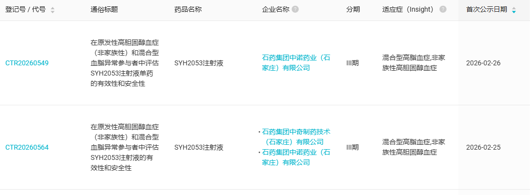 根据 Insight 数据库,石药集团于 2 月 25-26 日登记了两项 SYH2053 注射液的国内 Ⅲ 期临床(CTR20260564、CTR20260549),以评估 SYH2053 单药治疗原发性高胆固醇血症(非家族性)和混合型血脂异常受试者的有效性和安全性。