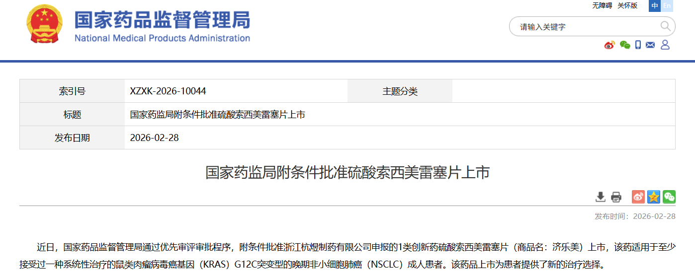 2 月 28 日,NMPA 官网显示,济民可信子公司杭煜制药申报的硫酸索西美雷塞片获批上市,适用于至少接受过一种系统性治疗的鼠类肉瘤病毒癌基因(KRAS)G12C 突变型的晚期非小细胞肺癌(NSCLC)成人患者。此前该适应症已被纳入优先审评程序。