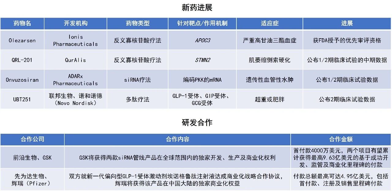 近期,全球多肽和寡核苷酸(TIDES)领域迎来系列进展。Ionis Pharmaceuticals公司用于治疗严重高甘油三酯血症(sHTG)的反义寡核苷酸(ASO)疗法olezarsen的补充新药申请(sNDA)获美国FDA受理,并被授予优先审评资格。联邦生物与诺和诺德(Novo Nordisk)共同开发的长效三靶点多肽疗法UBT251的中国2期临床研究结果积极,治疗24周后患者的平均体重降幅最高达19.7%。本文将节选其中部分重要进展做简单介绍,仅供读者参阅。