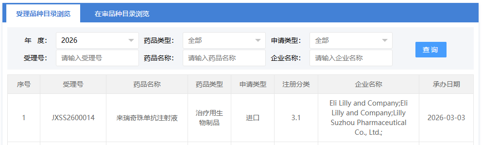 3 月 3 日,CDE 官网显示,礼来的来瑞奇珠单抗注射液上市申请获受理,注册分类为 3.1 类。根据公开信息和临床试验进展,Insight 数据库推测本次申报适应症为特应性皮炎。