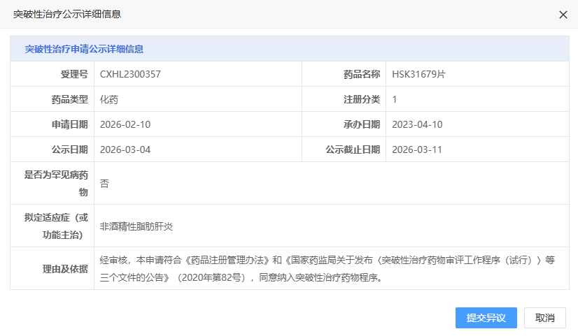 3 月 4 日,CDE 官网显示,海思科 1 类新药 HSK31679 片拟纳入突破性疗法,治疗非酒精性脂肪肝炎。