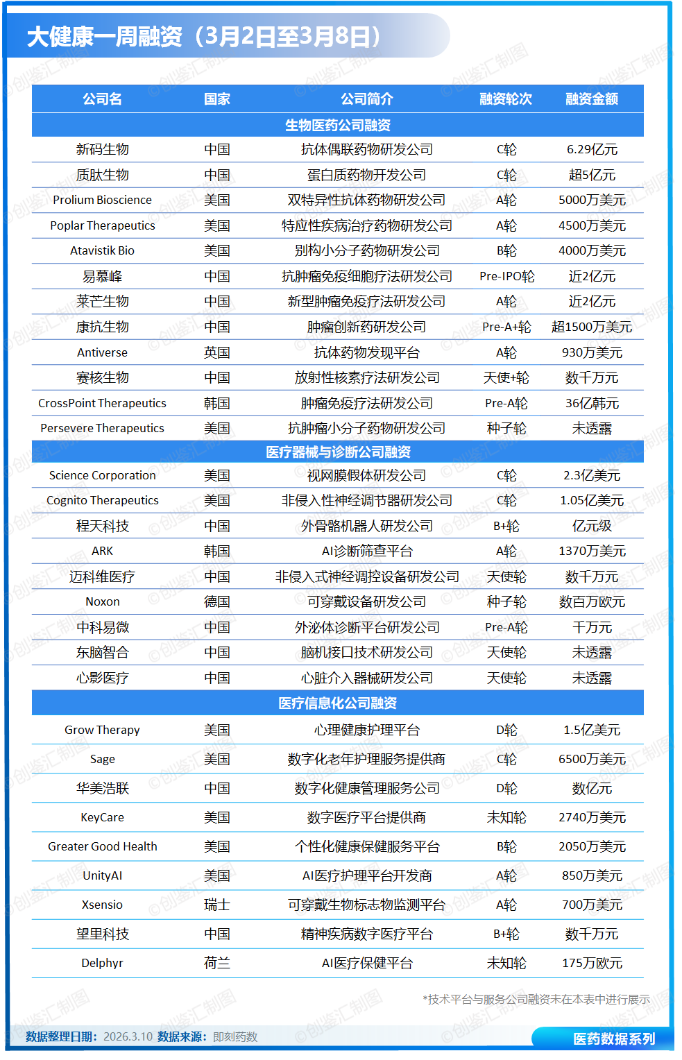 据创鉴汇不完全统计,上周(3月2日至3月8日)全球大健康领域共披露融资事件35起,总金额近11.2亿美元。