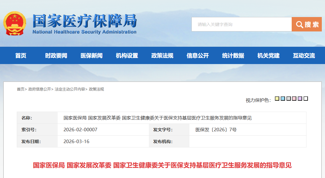 3月16日,国家医保局、国家发改委、国家卫健委联合发布《关于医保支持基层医疗卫生服务发展的指导意见》(医保发〔2026〕7号),三部门联合发文,为基层医疗机构的发展赋予了强大的政策动能。