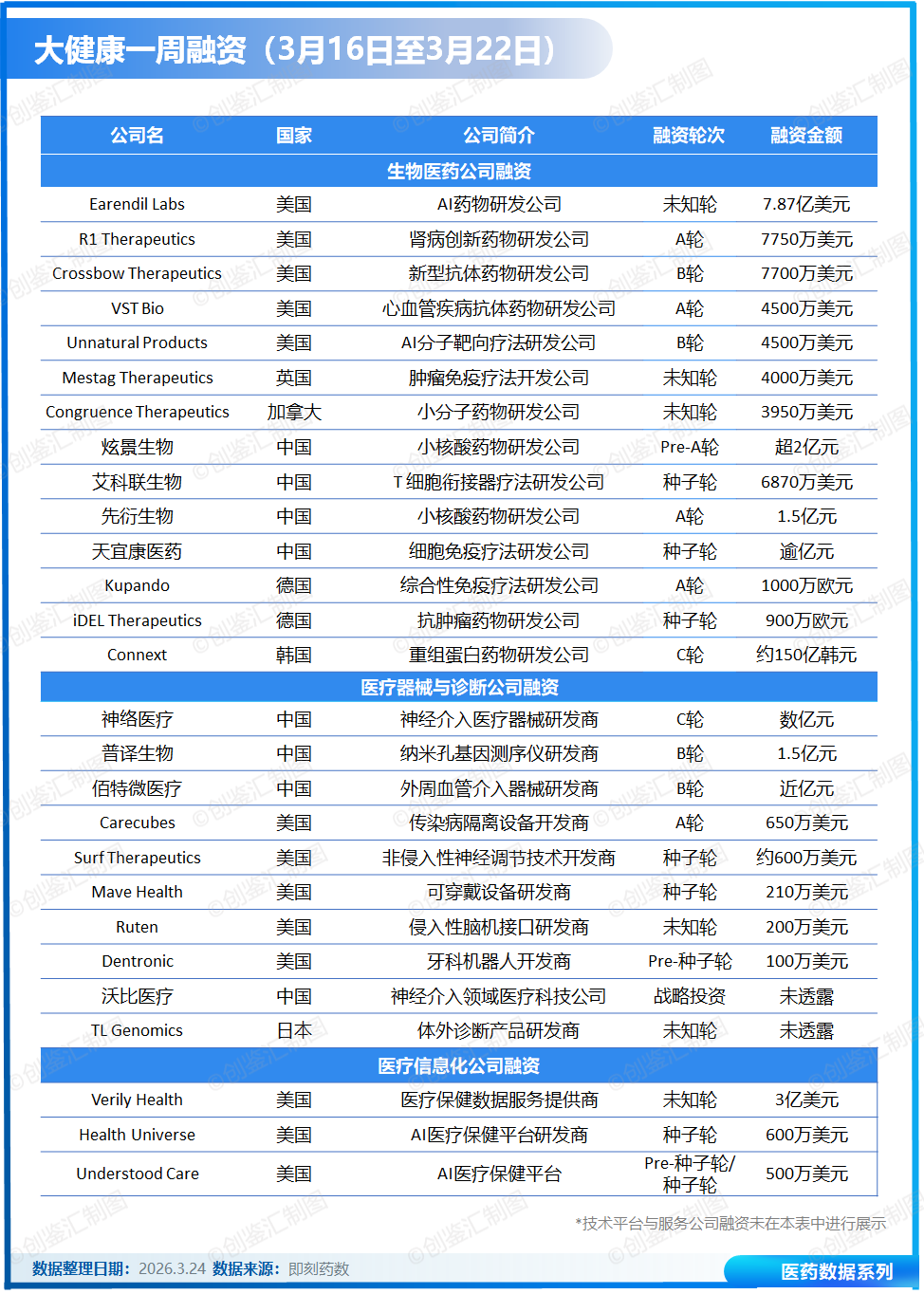 据创鉴汇不完全统计,上周(3月16日至3月22日)全球大健康领域共披露融资事件29起,总金额超16.6亿美元。