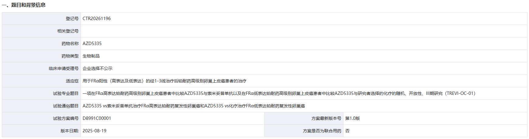 4月3日,药物临床试验登记与信息公示平台官网显示,阿斯利康登记了一项AZD5335 用于叶酸受体α(FRα)阳性(高表达及低表达)的经1-3线治疗后铂耐药高级别卵巢上皮癌患者治疗的Ⅲ期临床(登记号:CTR20261196)。