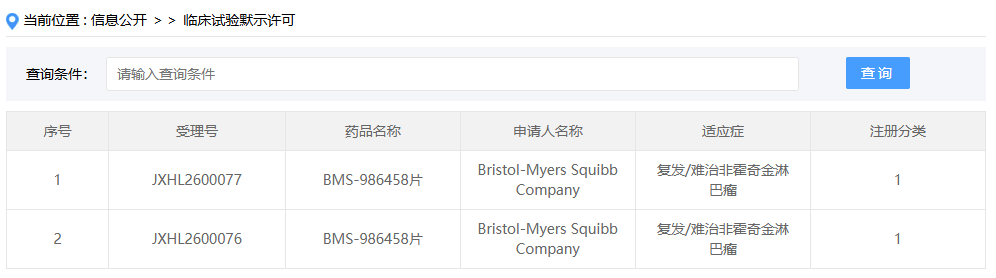 近日,CDE 官网显示,BMS 申报的 1 类新药 BMS-986458 片获批临床,用于复发/难治非霍奇金淋巴瘤。